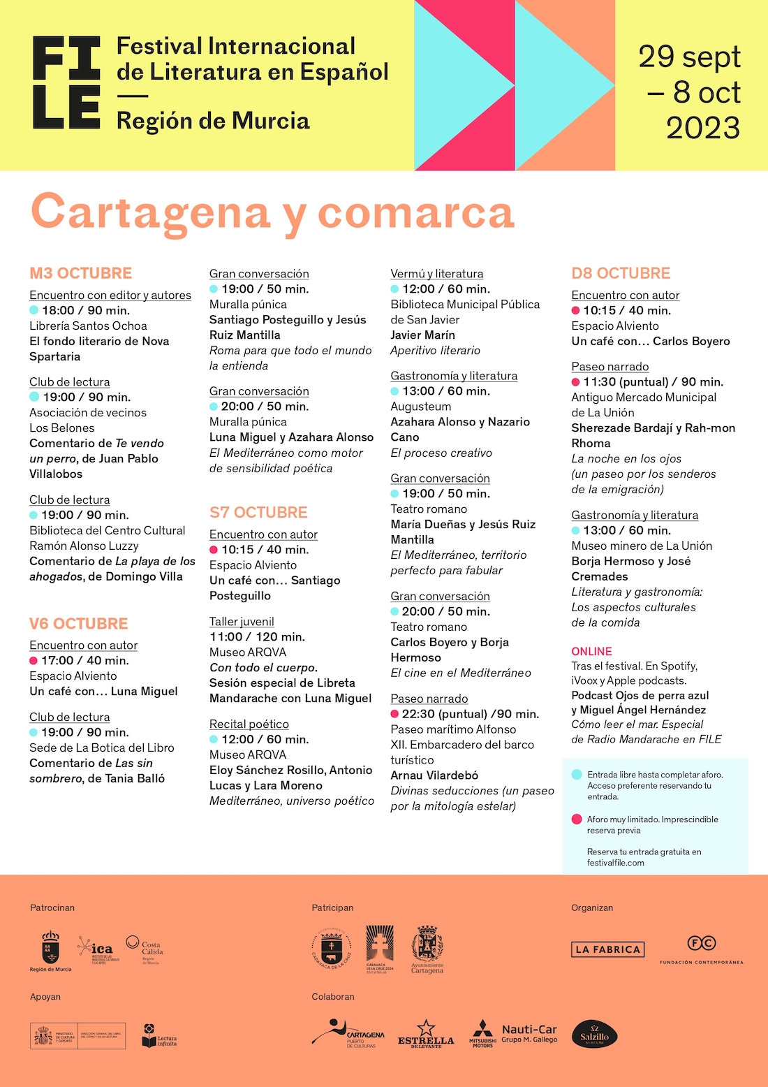Comienzas las actividades que el Festival Internacional de Literatura en Español -FILE- va a llevar a cabo en Cartagena. Este martes, 3 de octubre, en la librería Santos Ochoa habrá un encuentro con el editor de Nova Spartaria, Francisco Velasco, y algunos de sus autores que darán a conocer su fondo literario. A su vez, en Los Belones, se realizará el club de lectura de la asociación de vecinos sobre el libro 'Te vendo un perro' de Juan Pablo Villalabos.