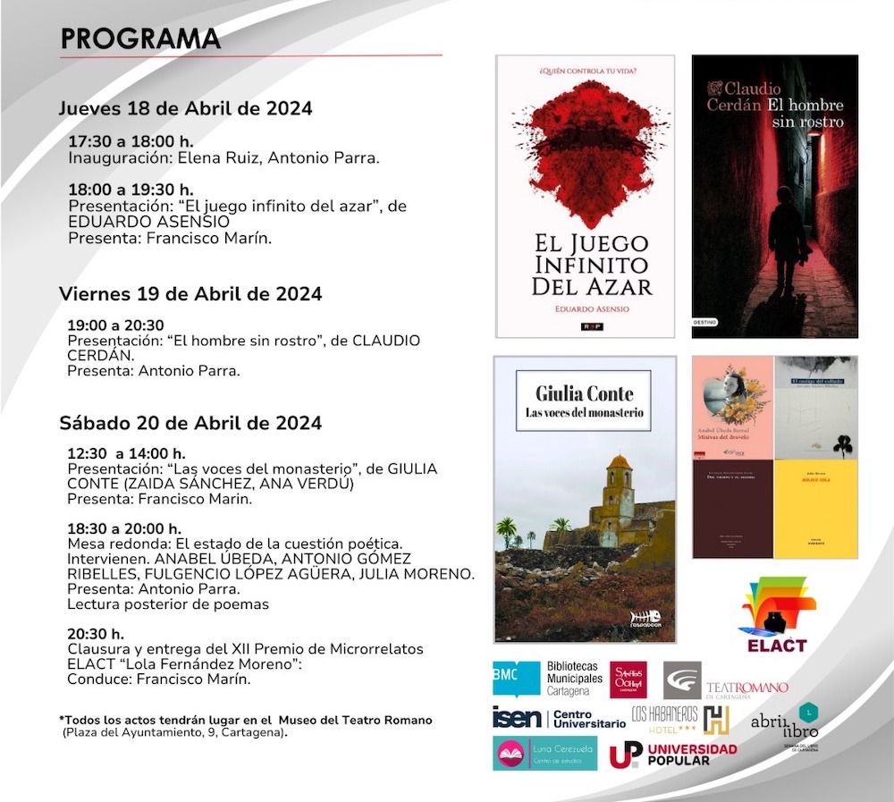 La décimo segunda edición del 'Encuentro literario de autores de Cartagena' se desarrollará del 18 al 20 de abril en el salón de actos del Museo del Teatro Romano con presencia de Eduardo Asensio, Claudio Cerdán, Zaida Sánchez, Ana Verdú, Anabel Úbeda, Antonio Gómez, Fulgencio López y Julia Moreno, entre otros.