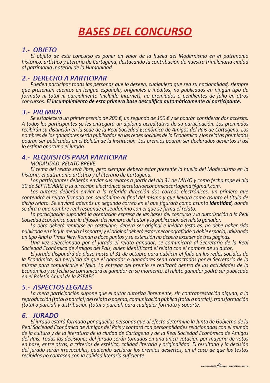 Los textos para participar en la tercera edición del certamen 'Cartagena, ciudad modernista' ya se pueden enviar a la Real Sociedad Económica de Amigos del País de Cartagena, siendo la fecha tope para presentarlos la del 30 de septiembre. Los dos primeros premios recibirán 200 y 150 euros, respectivamente.