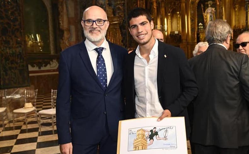 El dibujante cartagenero (en la foto con Carlos Alcaraz y la viñeta que dedicó al tenista) ofrecerá su alocución a las siete de la tarde de una primera jornada en la plaza de España que incluye, además de la presencia de un elenco de escritores, editoriales y librerías entre las cincuentas casetas, actividades infantiles, lecturas compartidas y, entre otras propuestas, un concierto de música renacentista y medieval.