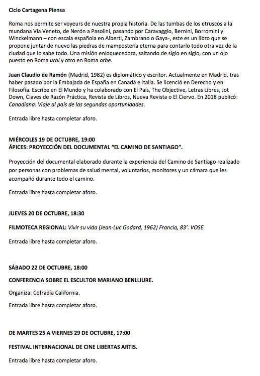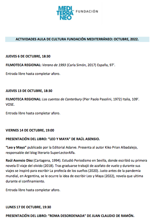 La programa de octubre y noviembre incluye la proyecciones de películas seleccionadas por el periodista y escritor cartagenero, como 'Un maldito embrollo', 'a infancia de Iván', 'Código del hampa' y 'El tormento del éxtasis' en el aula 'Ramos Carratalá' de la Fundación Mediterráneo, en la calle Mayor, donde también se podrán ver 'Verano de 1993', 'Los cuentos de Canterbury', 'Vivir su vida' y 'Qué bello es vivir'. La entrada es gratuita.