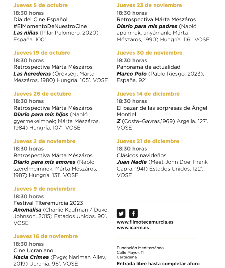 Asimismo, la actividad en Cartagena de la Filmoteca estará protagonizada por la retrospectiva sobre Márta Mészáros, la cineasta húngara considerada una de las directoras pioneras y referencia dentro del séptimo arte.