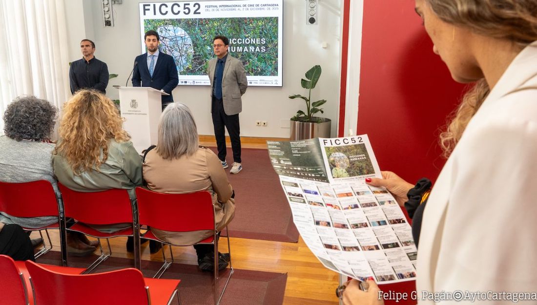 El Festival Internacional de Cine de Cartagena ha presentado hoy en el Palacio Consistorial la programación completa del FICC52, que tendrá lugar del 26 de noviembre al 2 de diciembre. En la presentación han participado: la alcaldesa de Cartagena, Noelia Arroyo; el concejal de Cultura, Ignacio Jáudenes Murcia; el presidente del FICC, Nacho Ros; la secretaria General del FICC, Cristina Roca; Laura Peñafiel, miembro de la Junta Directiva del FICC; y María José Espín, miembro del equipo de programación del FICC. Además, han estado acompañados por el director del Instituto de Industrias Culturales y las Artes de la Región de Murcia (ICA), Manuel Cebrián; el director General de la Unión Europea en la Región, Adrián Zitelly; y la rectora de la Universidad Politécnica de Cartagena (UPCT), Beatriz Miguel.