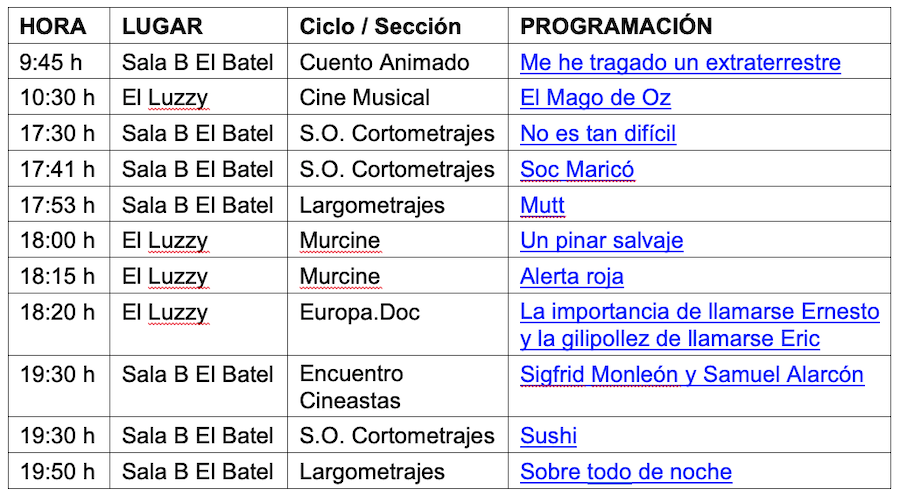 Las secciones paralelas comienzan el lunes con el ciclo Cuento Animado, a las 9:45 horas (sala B del Auditorio El Batel). Este ciclo selecciona largometrajes animados para que alumnos de Primaria puedan disfrutar de la experiencia de un festival de cine. El lunes 27 de noviembre comienza el ciclo con la proyección de Me he tragado un extraterrestre, una historia de alienígenas que acaban aterrizando en la Tierra y contando con la ayuda de un chico de 16 años, para tratar de acabar con un malvado intergaláctico sin que se interrumpa la vida normal en el instituto.