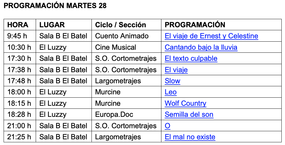 Las secciones paralelas comienzan el martes con el ciclo Cuento Animado, a las 9:45 horas (sala B del Auditorio El Batel). Este ciclo selecciona largometrajes animados para que alumnos de Primaria puedan disfrutar de la experiencia de un festival de cine. El martes 28 de noviembre comienza el ciclo con la proyección de El viaje de Ernest y Celestine, que cuenta cómo los protagonistas vuelven al país de Ernest para arreglar su violín estropeado, y descubren que la música ha sido prohibida en el país desde hace años. Así transcurre la historia mientras los protagonistas y sus cómplices tratan de poner fin a esta injusticia y traer de nuevo la alegría al país de los osos.