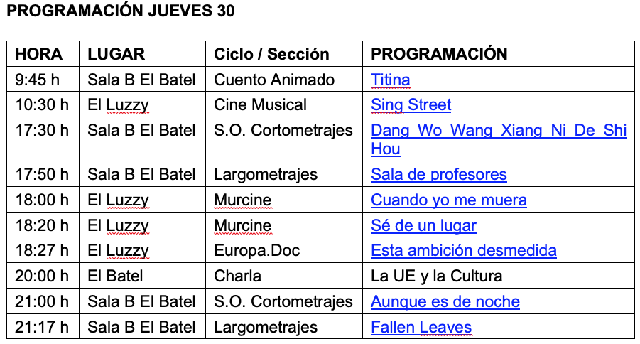 La cuarta jornada del Festival Internacional de Cartagena continúa el miércoles con la Sección Oficial de Cortometrajes con la proyección, a las 17:30 horas, del corto Dang Wo Wang Xiang Ni De Shi Hou, del cineasta chino Shuli Huang. A continuación, se proyecta el largometraje Sala de profesores, del director alemán Ilker Çatak. La cinta trata de reflejar la vida diaria en una escuela pública alemana y sus retorcidas estructuras de poder, a través de la mirada de una joven y prometedora profesora. La película obtuvo el Premio Europa Cinemas Label, en la sección Panorama del Festival de Berlín 2023, y fue finalista al Premio Lux del Parlamento Europeo, además de ser la candidata para representar a Alemania en los Oscar 2024 en la categoría de Mejor Película Internacional.