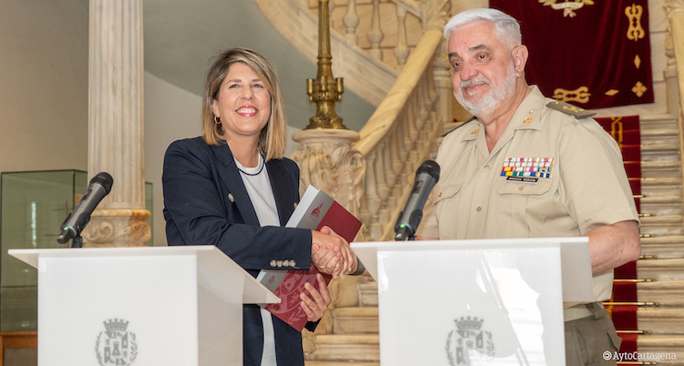 Tras la firma de un acuerdo histórico del consistorio con el ministerio, Defensa cede más de 90 hectáreas de superficie que integran el castillo, las baterías de Fajardo, La Podadera y del Collado, y el Fuerte de Navidad, siendo la idea trabajar para un gran proyecto de recuperación que ponga a todos ellos en valor. En la foto, la alcaldesa con el general de brigada Sebastián Marcos Morata, natural de Cartagena