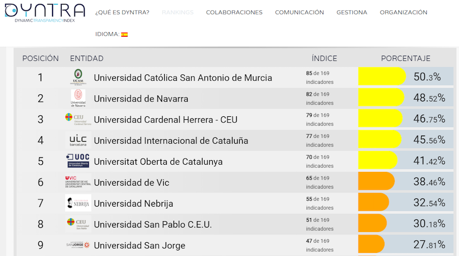 El último informe sobre la transparencia de las universidades españolas elaborado por la plataforma Dinamic Transparency Index (Dyntra) sitúa a la Católica de Murcia como la universidad privada más transparente de nuestro país, tras analizar 169 indicadores en un total de 27 universidades privadas. La UCAM destaca especialmente en ‘Comunicación pública’, ‘Participación y colaboración’ y ‘Transparencia institucional’. Dyntra se caracteriza por trabajar en tiempo real y de forma dinámica, por lo que las evaluaciones están permanentemente abiertas, pudiéndose actualizar el nivel de transparencia en cualquier momento.