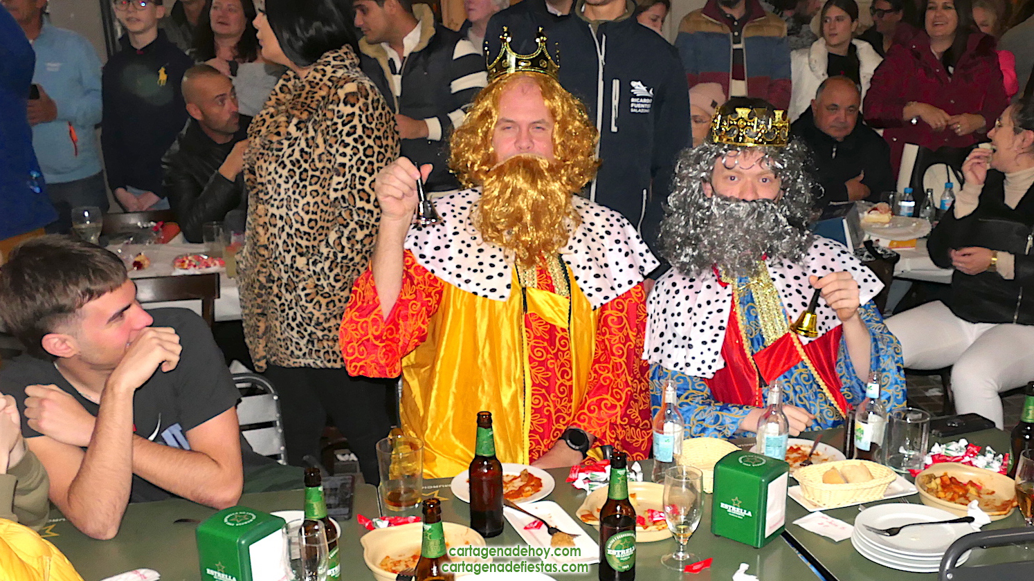 No sólo de cabalgatas y de entregar juguetes viven los Reyes Magos, como demuestran estos dos singulares Melchor y Gaspar en un avituallamiento en la calle del Carmen de Cartagena mientras pasaba el gran desfile de carrozas de la noche de Reyes.
