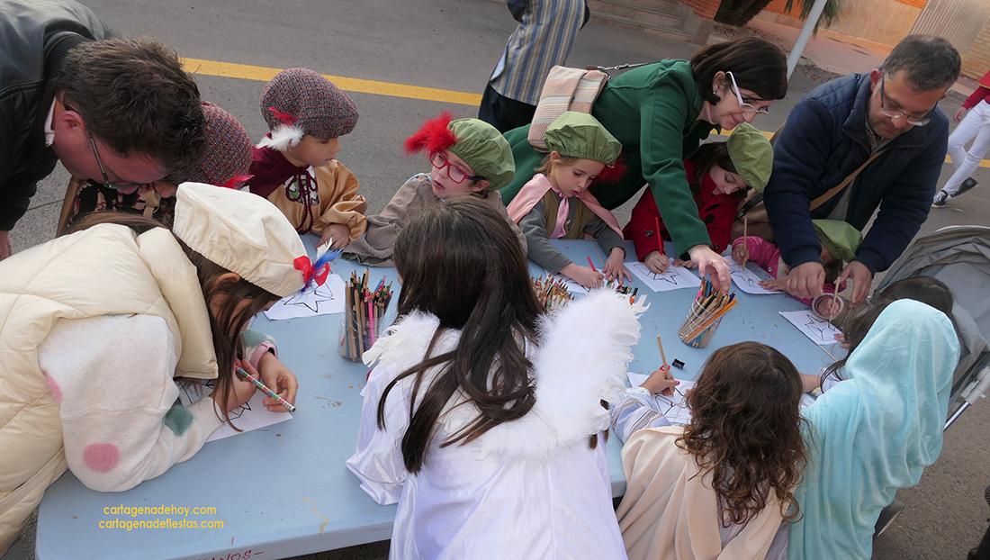 La comitiva de los Magos de Oriente por la Barriada de Hispanoamérica hizo varios altos para llevar a cabo diversos talleres con los pequeños pajes, angelitos y otros personajes belenistas que acompañaron a sus majestades.