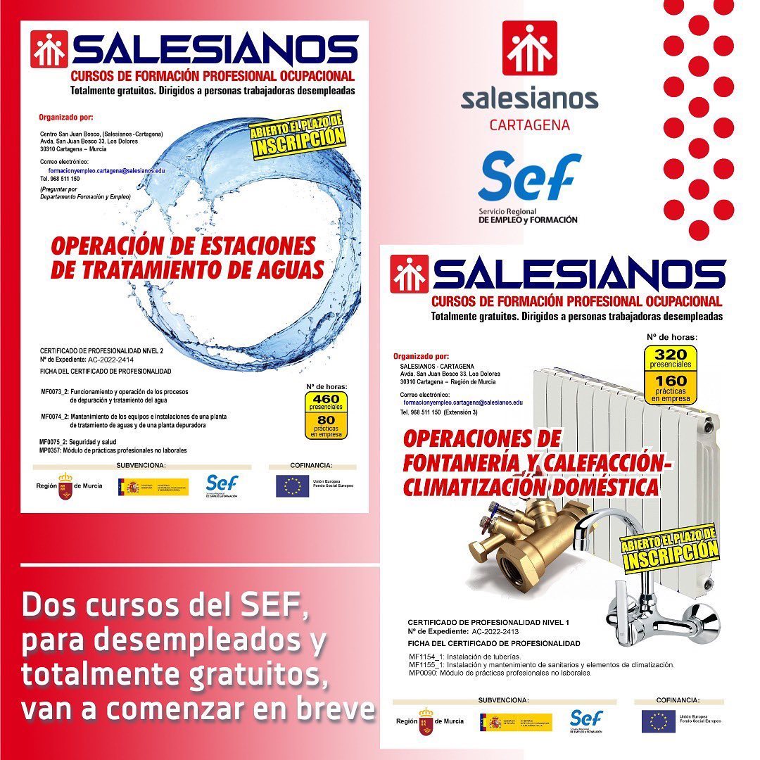 ‘Operación de estaciones de tratamiento de aguas’ y ‘Operaciones de fontanería y calefacción-climatización doméstica’ son los cursos que están a punto de comenzar en las instalaciones del complejo docente de Los Dolores. Son totalmente gratuitos para personas desempleadas y el plazo de inscripción está abierto. Con ellos se aumenta el grado de empleabilidad. Se desarrollan en horario de tarde.
