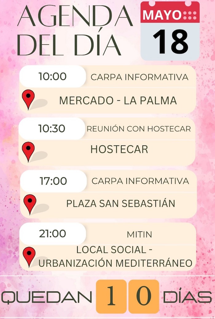 Séptimo día de campaña electoral, en el que los integrantes de la candidatura de MC estarán en La Palma, plaza de San Sebastián de la ciudad y Urbanización Mediterráneo, además de mantener una reunión con Hostecar. El PP, por su parte, estará con vecinos de La Aparecida y con agricultores en La Palma. Quedan 10 días para la cita con las urnas.