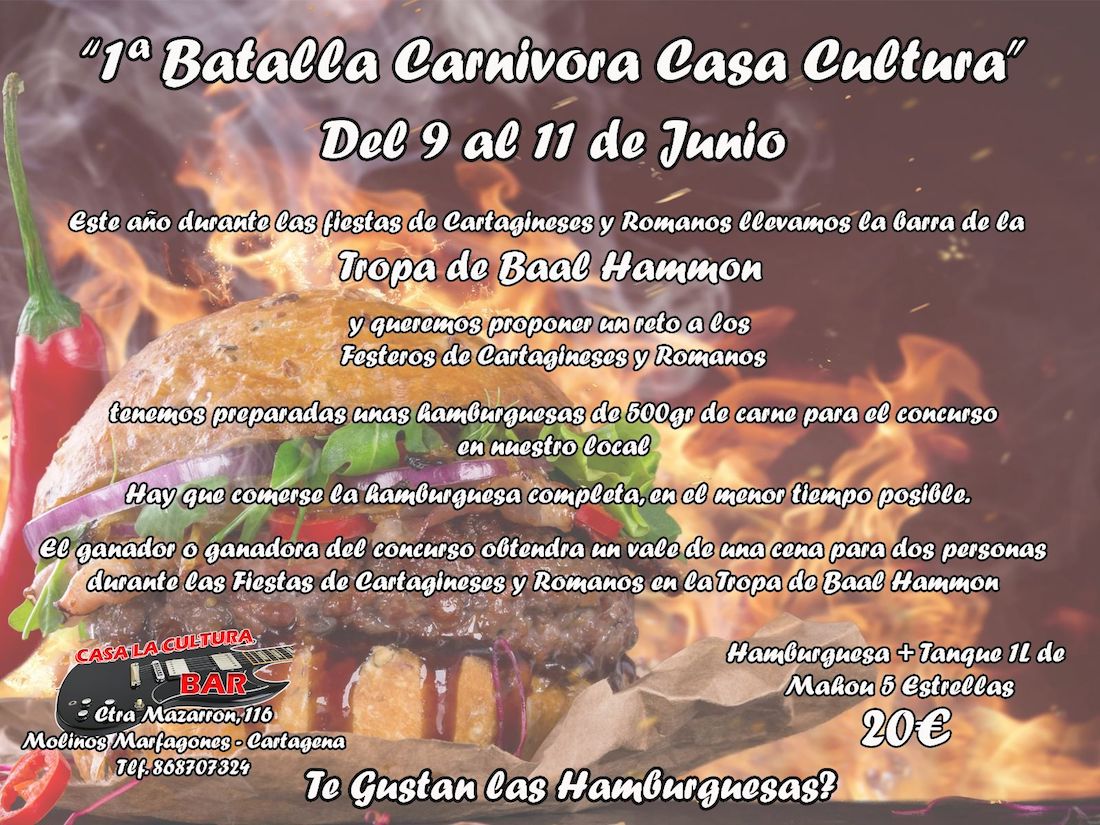 La tapería-cafetería obsequiará con una cena para dos personas al festero que devore una hamburguesa de medio kilo en el menor tiempo posible. El premio lo disfrutará durante las fiestas en el campamento de Tropa de Baal-Hammon, cuya barra llevara esta empresa hostelera. Esa súper-hamburguesa con un litro de Mahou 5 estrellas estará al alcance de todos del 9 al 11 de junio por 20 euros. Además, durante este mismo (largo) fin de semana también tenemos un menú 'Fiesta USA' basado en comida americana.