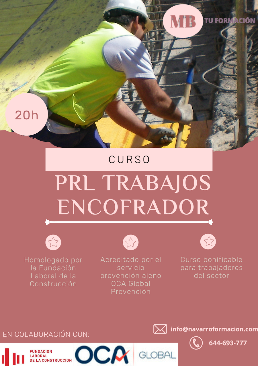 Homologado por la Fundación Laboral de la Construccion y el servicio de prevención ajeno OCA Global, está acreditado por el servicio prevención ajeno OCA Global Prevención y bonificable para trabajadores del sector. El curso de 20 horas comienza este sábado próximo (17 de junio) y se prolongará durante los días 24 de junio y uno de julio. Quedan unas pocas plazas libres. Apúntate ya. Tu futuro está en juego.