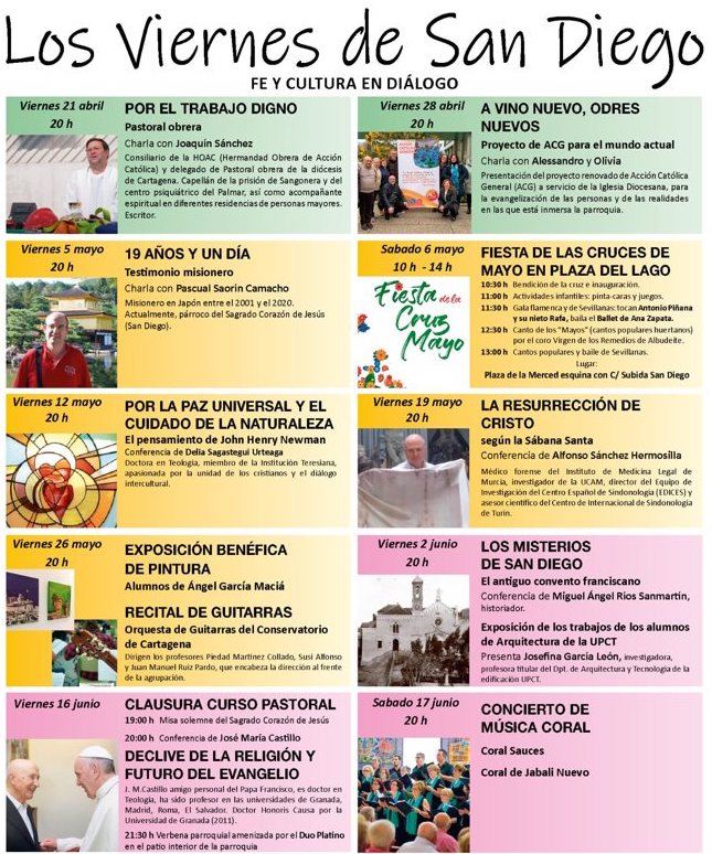 El programa sigue en junio. El 2 de junio se presentará la exposición Los misterios de San Diego, del estudio arquitectónico del templo parroquial, antiguo convento de San Diego, realizado por los alumnos de la Universidad Politécnica de Cartagena (UPCT). Con el mismo nombre tendrá lugar una charla, a cargo de Miguel Ángel Ríos, profesor emérito de la UPCT. La actividad se recuperará el viernes 16, en la solemnidad del Sagrado Corazón de Jesús, titular de esta parroquia. A las 20:00 horas tendrá lugar la celebración de la Eucaristía, después se clausurará el curso con una verbena popular en el patio parroquial. Los Viernes de San Diego se cerrarán con el concierto de la Coral Sauces y la coral de Javalí Viejo, el sábado 17.