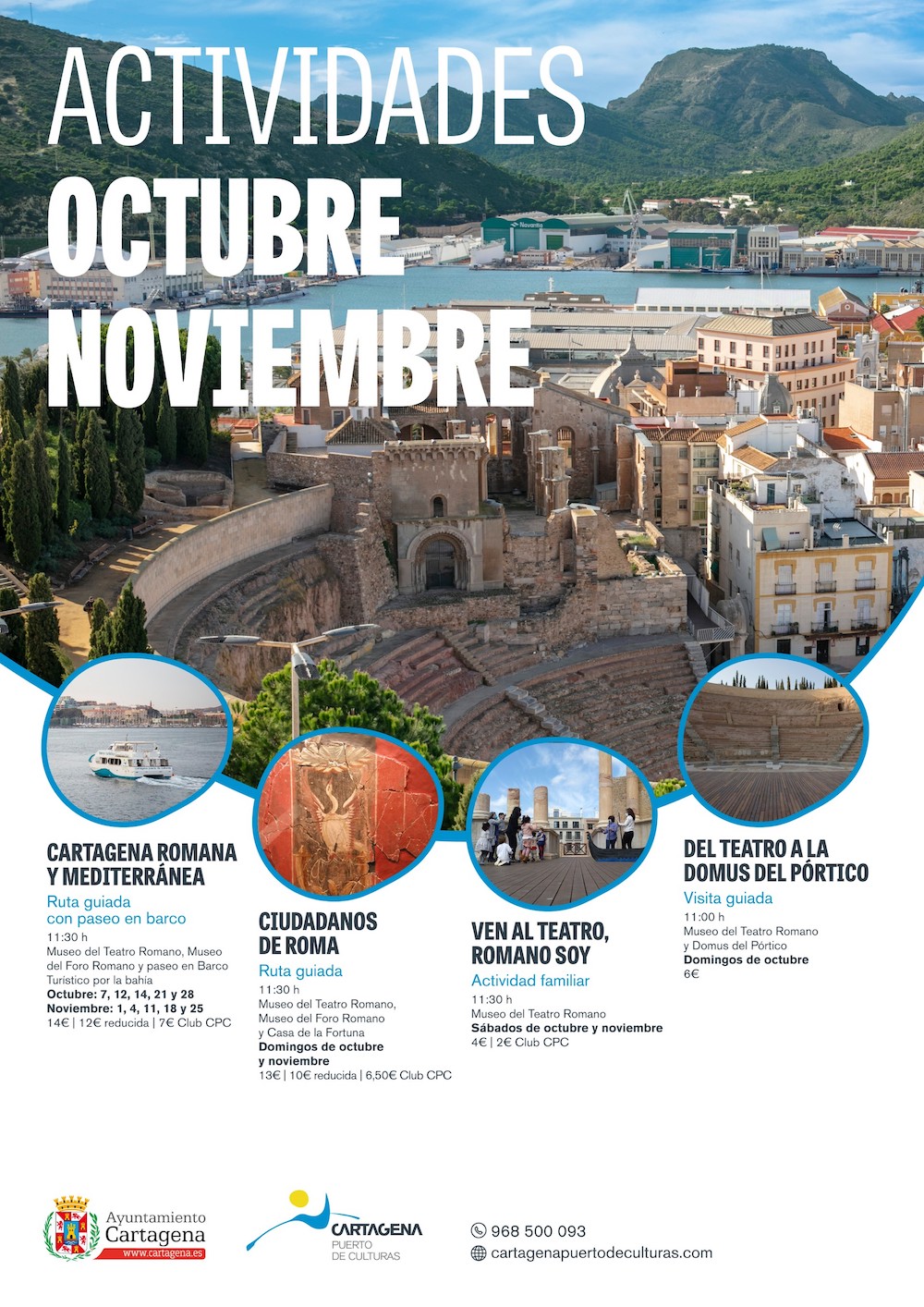 Recorrido: Museo del Teatro Romano, Museo del Foro Romano y Casa de la Fortuna Días: domingos de octubre y noviembre. Hora: 11:30. Salida desde el Museo del Teatro Romano, el Precio: 13 individual, reducida 10€. Club Cartagena Puerto de Culturas 6,50€.