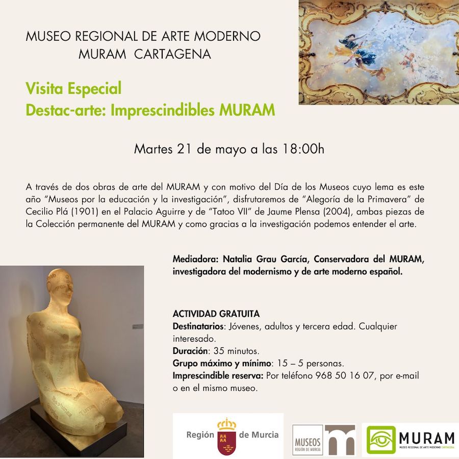 Dentro de las actividades del 'Día internacional de los museos', hoy se puede disfrutar de la visita especial 'Destac-ARTE: Imprescindibles' del Museo Regional de Arte Moderno, donde se profundizará en las obras de Cecilio Plá y Jaume Plensa, que forman parte de la colección del centro museístico regional de la plaza de la Merced de Cartagena, que tendrá extensión al Palacio de Aguirre.