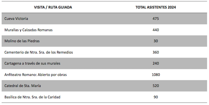 Pero sin lugar a dudas, los grandes protagonistas de nuestra oferta han sido Cueva Victoria, siempre supeditada a la condición mecánica del sistema de andamios que permite la visita, además de las condiciones interiores de la cueva para la realización de las mismas; la Catedral Vieja, coincidiendo con los días de apertura de la diócesis y por supuesto, el Anfiteatro Romano, que con la iniciativa propuesta este verano de “Abierto por Obras” y prolongada hasta esta misma semana, han contemplado el monumento 1.080 personas. Las visitas han estado coordinadas por personal técnico del Ayuntamiento de Cartagena y las ha llevado a cabo un grupo de guías oficiales pertenecientes a la empresa Cicerone, que se han ocupado del control de acceso, así como del diseño, acompañamiento y explicación de la misma.