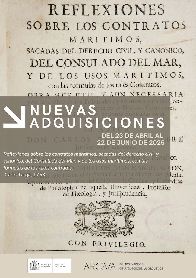 A partir del 23 de abril y hasta el 22 de junio, el museo exhibirá la obra, adquirida recientemente en subasta pública, ‘Reflexiones sobre los contratos marítimos, sacadas del derecho civil, y canónico, del Consulado del Mar, y de los usos marítimos con las fórmulas de los tales contratos’, de Carlo Targa y publicada en Madrid en la imprenta de Francisco Xavier García, en 1753.