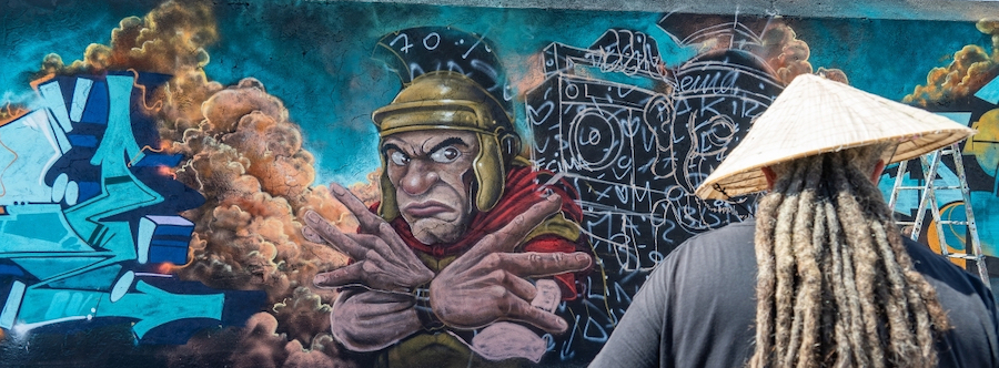 Motivos marineros, mitológicos y de las fiestas Carthagineses y Romanos repasan en el largo muro del dique, a través de obras de artistas urbanos, los tres mil años de historia de Cartagena.