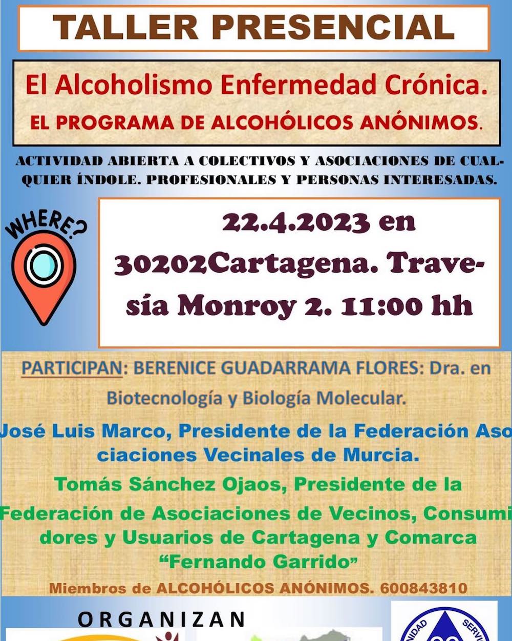 La sede de la Federación Vecinal de Cartagena, en Travesía Monroy de Santa Lucía, acoge este sábado (11 horas) este encuentro de representantes vecinales y especialistas que, bajo el título 'El alcoholismo enfermedad crónica. Programa de Alcohólicos Anónimos', es de asistencia libre.