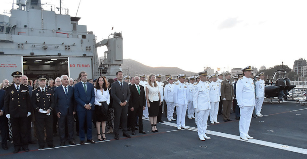 El buque de la Armada que está atracado en la terminal de cruceros ‘Juan Sebastián Elcano’ de Cartagena, acogió ayer la recogida de la enseña nacional en un acto que fue presidido por el vicealmirante Victoriano Gilabert Agote, Almirante de Acción Marítima. El fotógrafo cartagenero Luis Godínez ofrece un amplio reportaje gráfico.