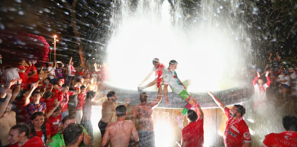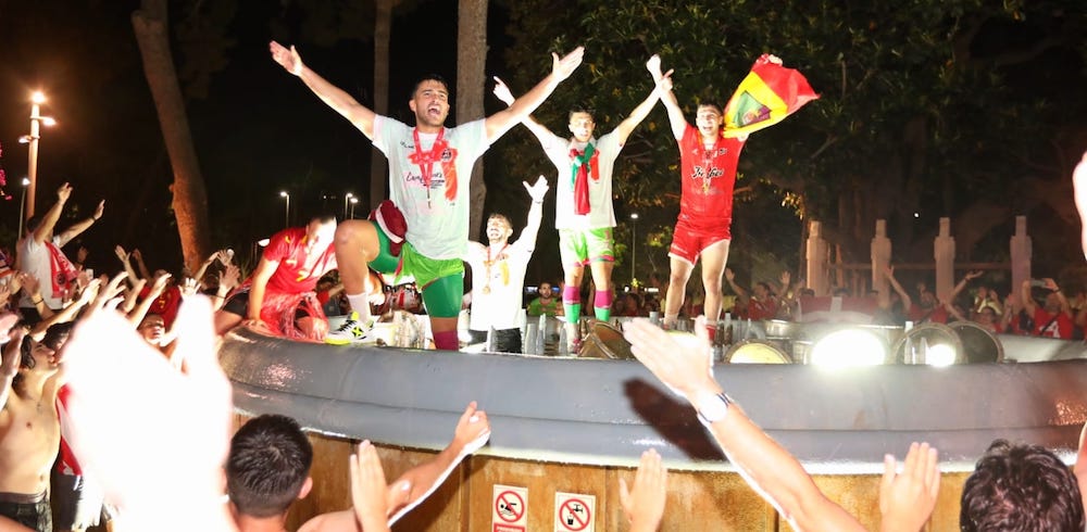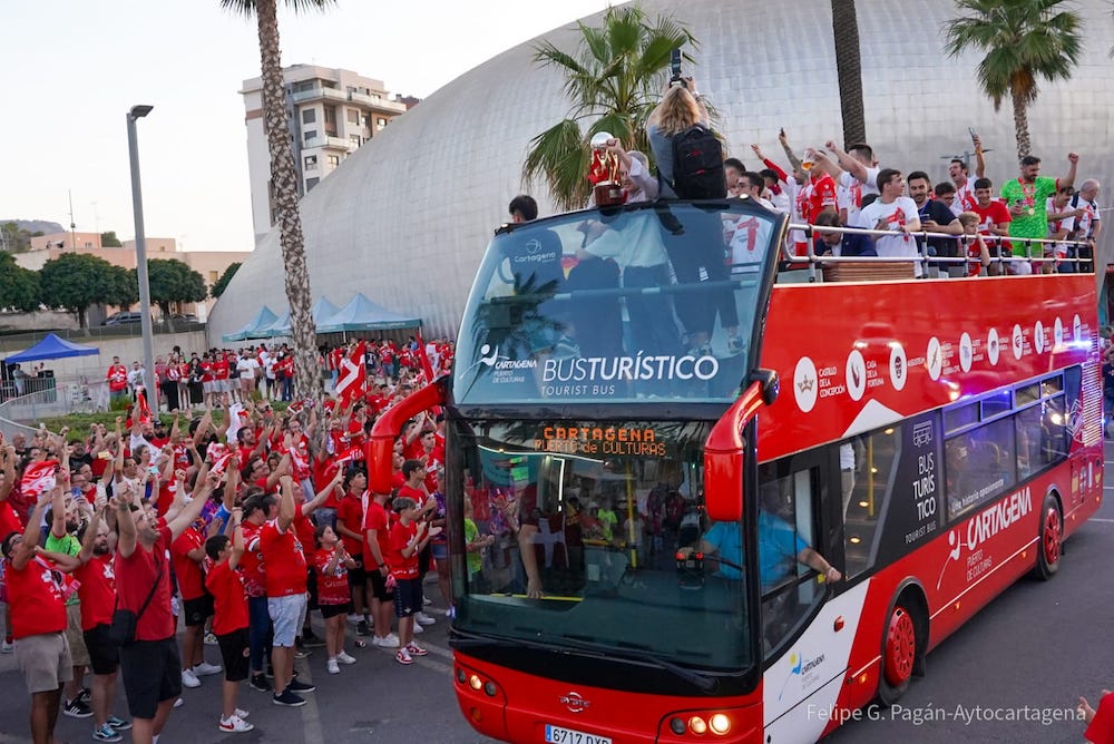 Ínter, Barcelona y ElPozo Murcia eran los únicos equipos que han ganado la Liga Nacional de fútbol sala desde 2001, pero este año el equipo Jimbee Cartagena se ha metido en ese ‘olimpo’ tras ganarla después de haber eliminado sucesivamente a los tres. La fiesta comenzó ayer en el Palacio recogiendo la copa y siguió por la calle, con baño en la plaza de España.