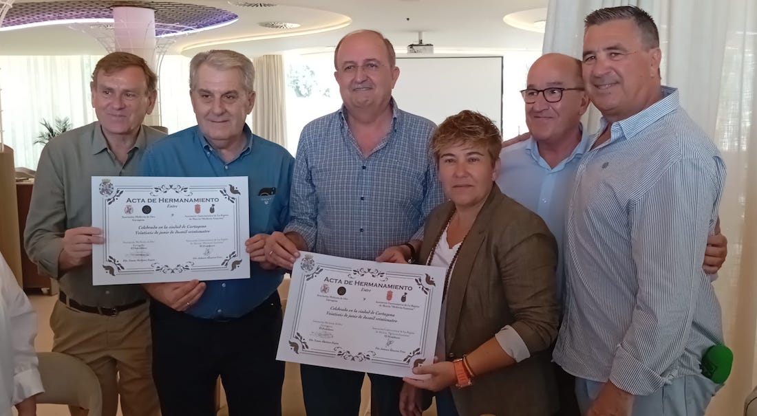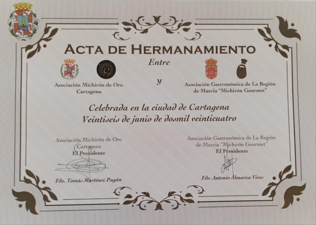 A continuación, se ha llevado a cabo el acto de hermanamiento entre la Asociación 'Michirón de Oro' de Cartagena y la Asociación 'Michirón gourmet' de Murcia mediante la firma de la correspondiente acta por parte de Tomás Martínez Pagán y Antonio Almarza Vives, presidentes de ambas entidades. “Sin lugar a dudas, este hermanamiento supone un compromiso mutuo por aumentar la colaboración entre las dos asociaciones”, han señalado.