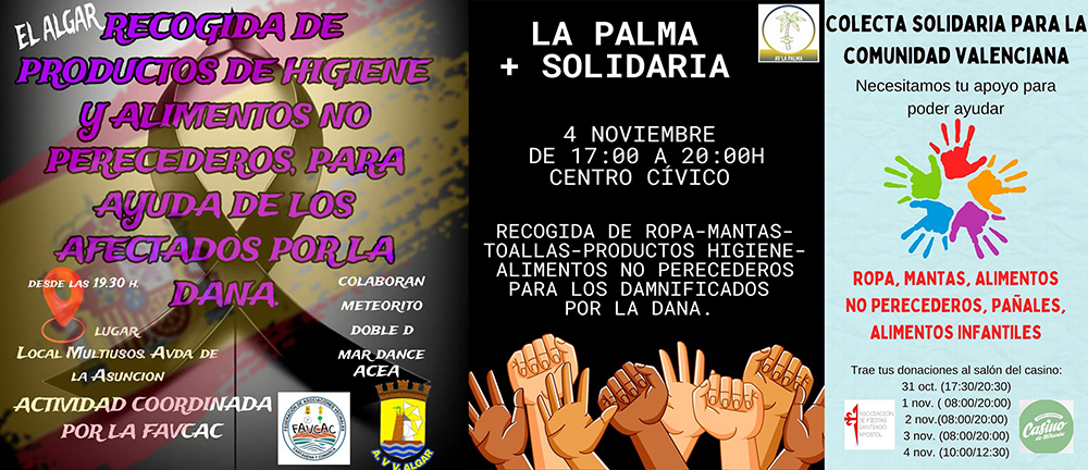 El Algar, Ciudad Jardín, La Palma y Miranda ya han preparado campañas de recogida de enseres y alimentos de primera necesidad para ayudar a las familias que han sufrido las consecuencias de la tragedia que ha tenido lugar en diversos puntos de España, especialmente en la Comunidad Valenciana.