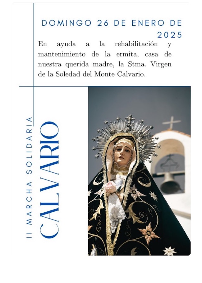 El 26 de enero tendrá lugar la segunda edición de la marcha solidaria que organiza la cofradía de la Soledad del Monte Calvario y que tiene como objetivo recaudar fondos para acometer reparaciones y trabajos de mantenimiento del edificio religioso situado en lo alto del monte del Calvario de Cartagena. La distancia es de 3,5 kilómetros.