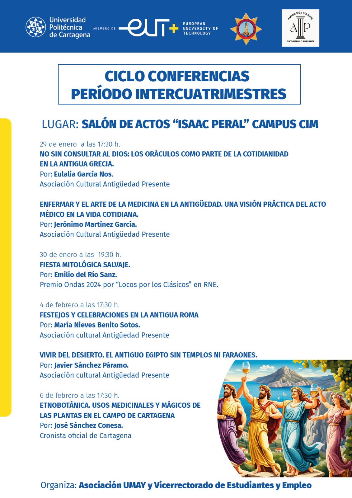Premio Ondas 2024 por el programa 'Locos por los clásicos' de Radio Nacional de España, ofrecerá una conferencia este jueves en el salón de actos 'Isaac Peral' dentro del ciclo de conferencias que organizan la Asociación UMAY y el vicerrectorado de Estudiantes y Empleo de la UPCT, que comienza hoy con una charla sobre los oráculos en la antigua Grecia a cargo de Eulalia García y que culminará el 6 de febrero conociendo los usos medicinales y mágicos de las plantas del Campo de Cartagena, que serán desvelados por José Sánchez Conesa. Entrada gratuita.