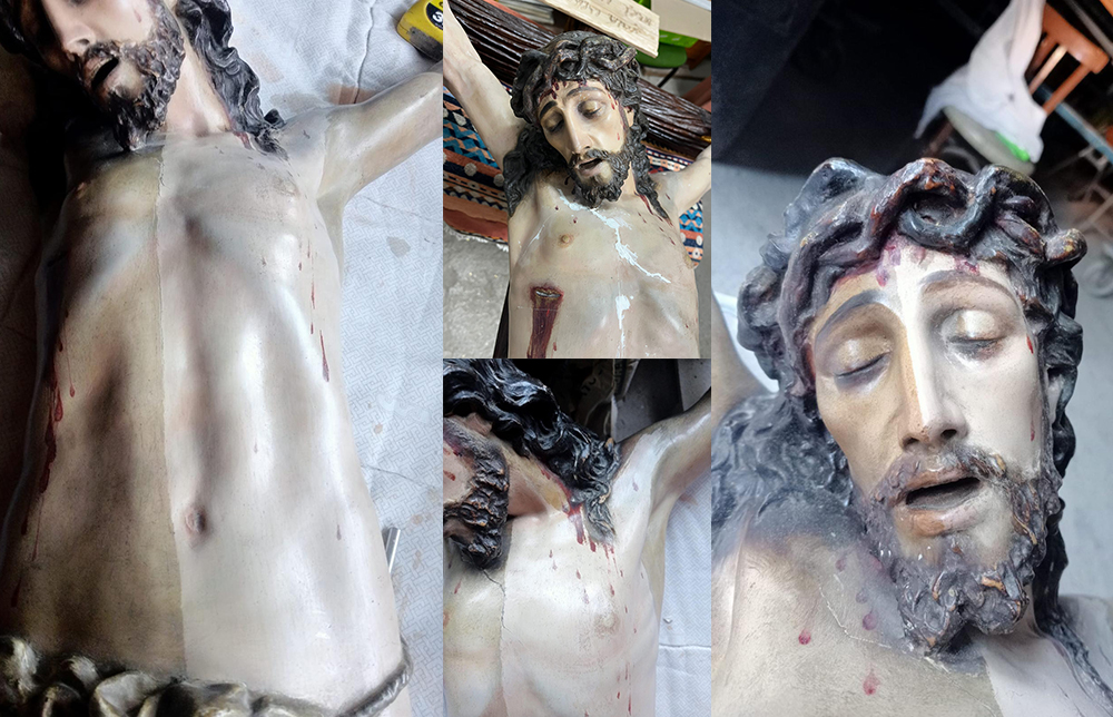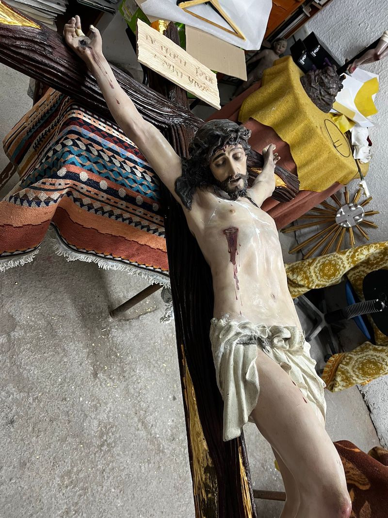 Destaca también un Cristo crucificado cuya talla esta en muy mal estado y que se encuentra en el taller de restauración, donde está recuperando su 'juventud' y que ahora, como indica Saúl Sánchez, va a contar con una cruz con madero redondo, réplica del que tenía en su origen. En esta labor de 'rejuvenecimiento' de la imagen cabe destacar las donaciones recibidas en la sacristía para ese fin.