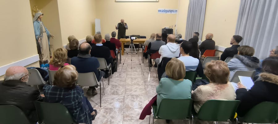 El acto comenzó con la bienvenida del Padre Pascual Saorin quien expuso que «esta es la primera sesión del 2025 del ciclo cultural 'Los viernes de San Diego' que realizamos desde el 2004 en esta parroquia del Sagrado Corazón de Jesús».