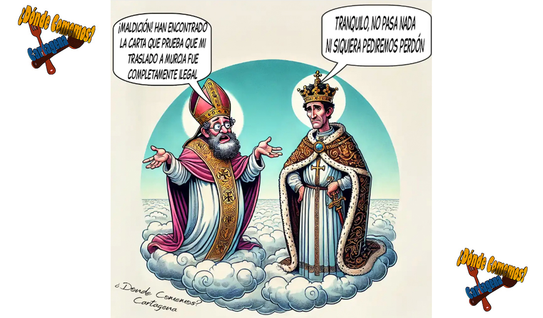 Iván Negueruela que no hay justificación documental histórico sobre el traslado del Obispado de Cartagena a la ciudad de Murcia y sí una carta papal que lo prohibía. Este asunto permite a Enrique Costa y Aida Belmonte, del portal '¿Dónde comemos?, Cartagena', ofrecer una nueva y sarcástica viñeta a los lectores.