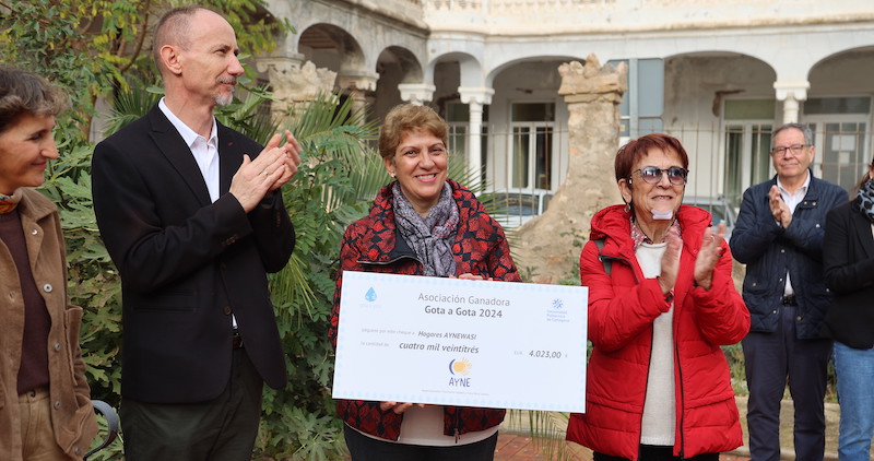 La recaudación del ‘Gota a gota’ de la Universidad Politécnica de Cartagena financiará desayunos y termos de agua caliente en los Hogares Aynewasi del país suramericano. Foto en la que se observa al rector aplaudiendo tras la entrega del cheque a las cooperantes del proyecto.