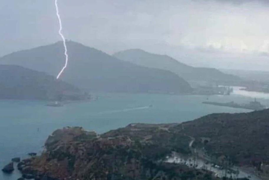 'Sergio Nova Ocio' publica en su perfil de Facebok la imagen de la descarga natural de electricidad estática que tuvo lugar en la dársena de Cartagena hace unos días, próxima a la zona del Club Náutico El Chalé y el faro de Navidad.