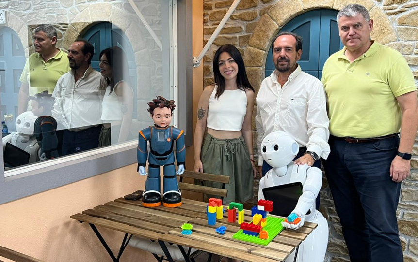 Imagen: Gema Benedicto, José Manuel Ferrández y Eduardo Hurtado junto a los robots Milo y Pepper en el laboratorio que simula una cafetería