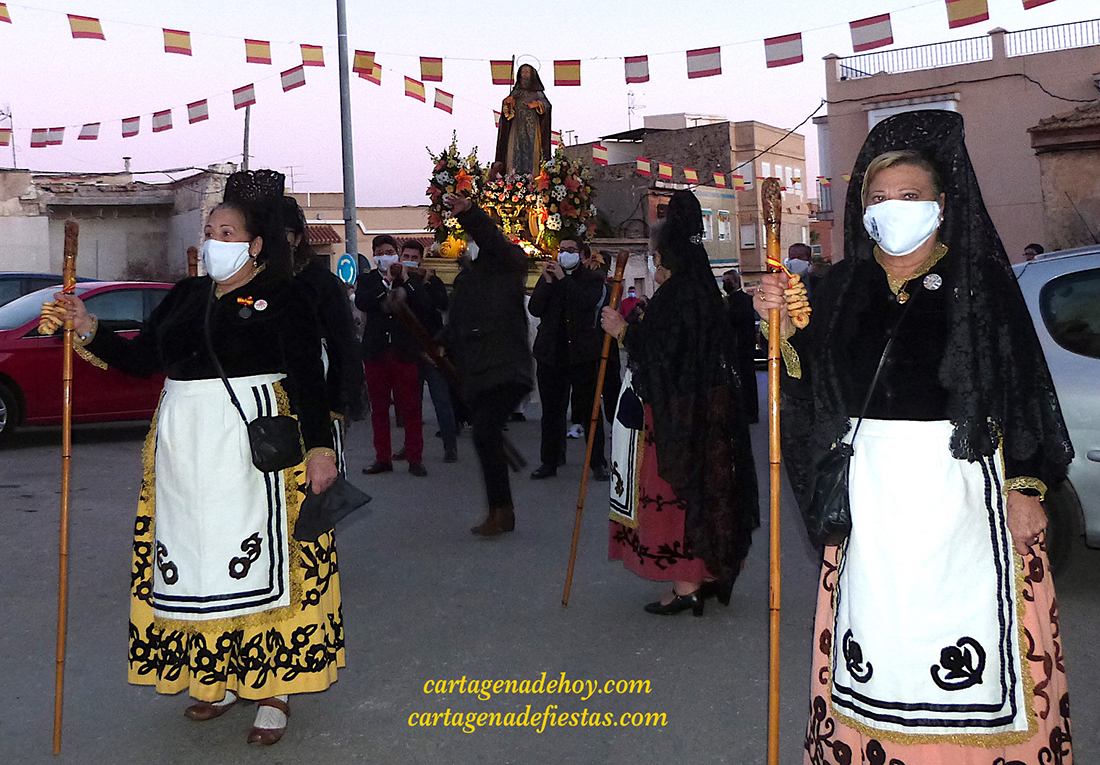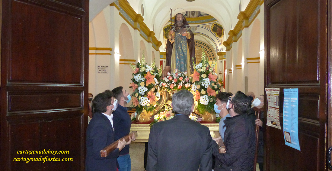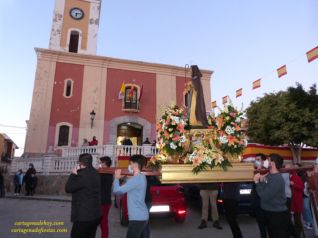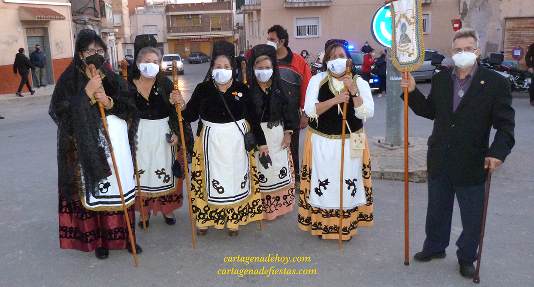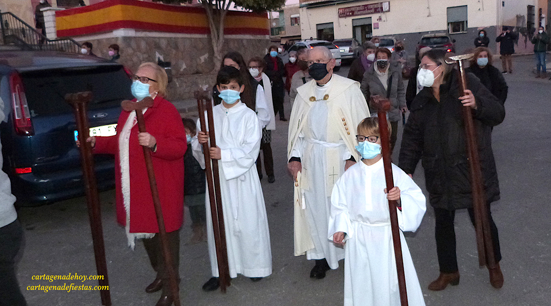 El trono salió de la iglesia y fue bajando los escalones de la elevada entrada hasta alcanzar la plaza, donde esperaban las portadoras del estandarte y el grupo de romeras de San Antón, que abrieron paso al trono avanzó con el sonido del golpe de tambor y que detrás llevaba al sacerdote Juan Apellániz, varios fieles y el grupo de la agrupación musical Cartagena 1990.