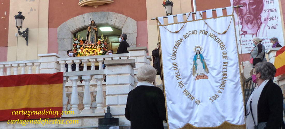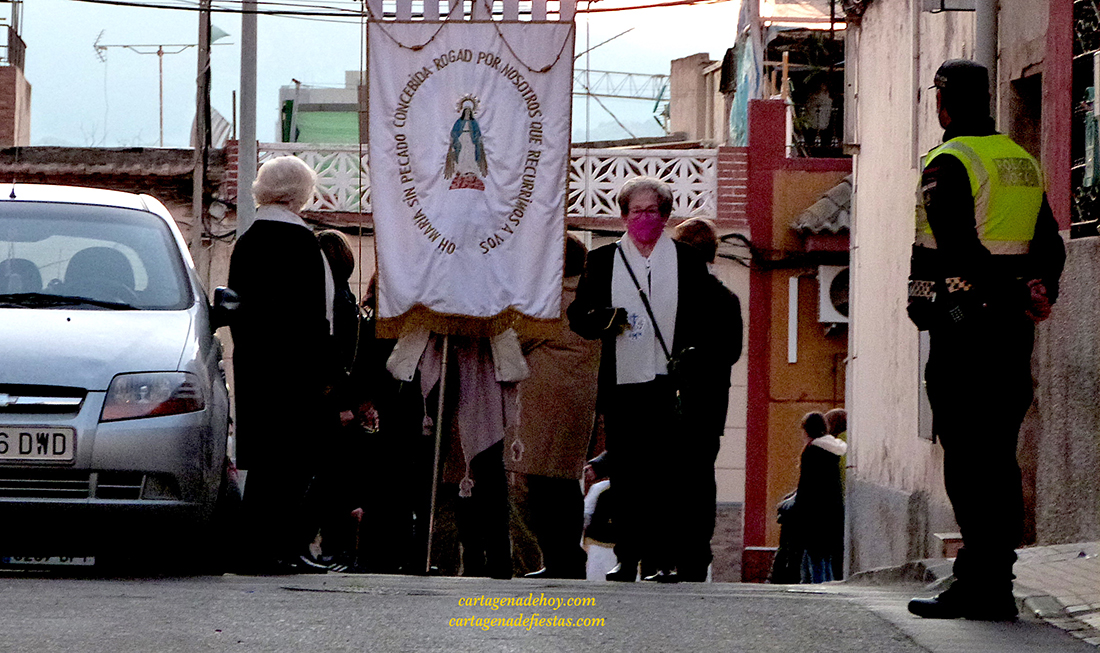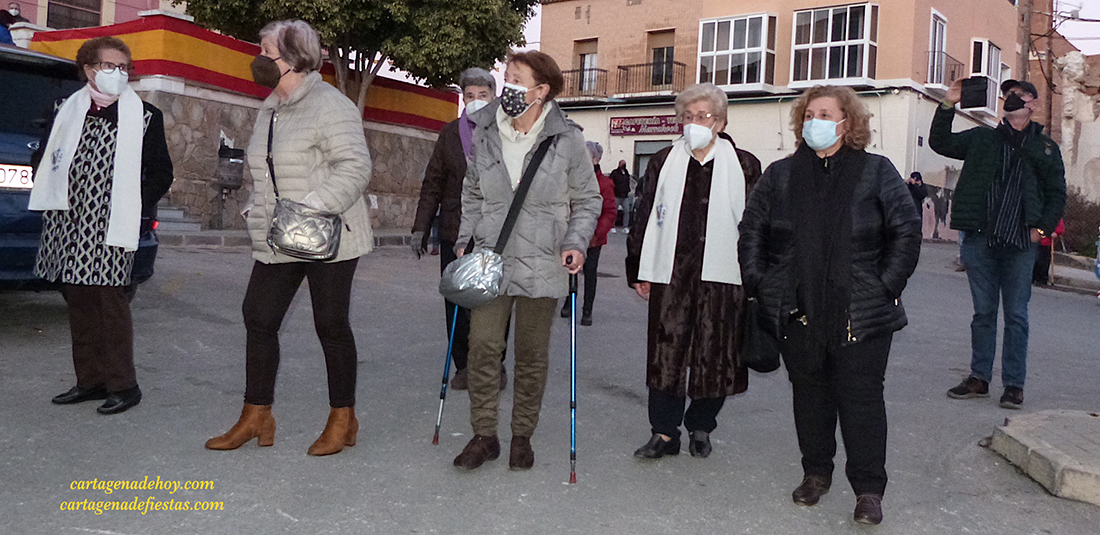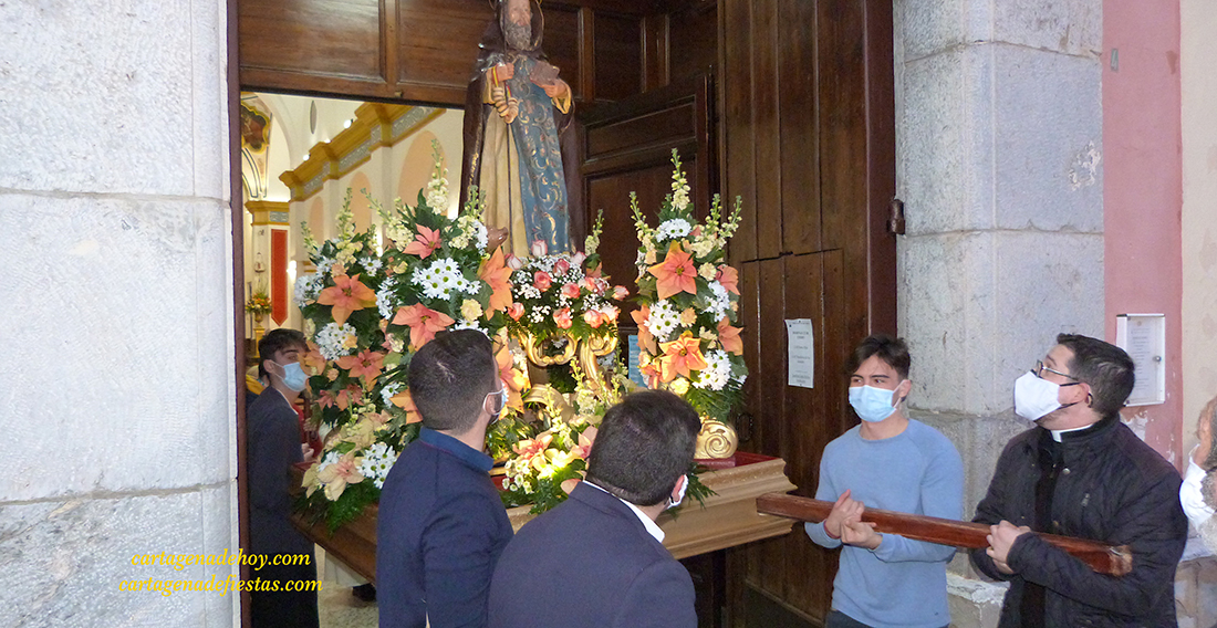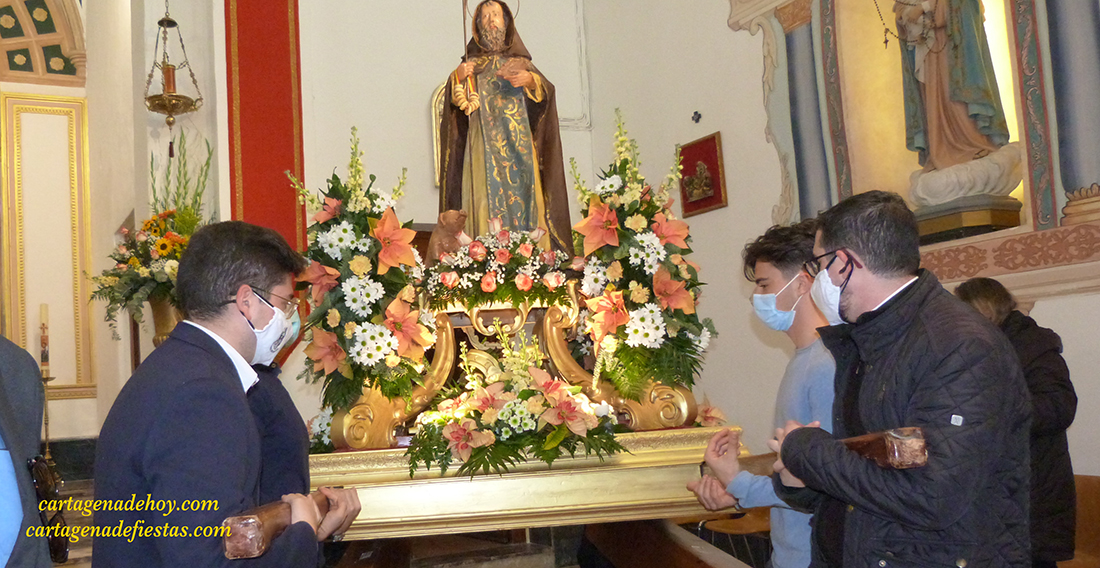 El trono salió de la iglesia y fue bajando los escalones de la elevada entrada hasta alcanzar la plaza, donde esperaban las portadoras del estandarte y el grupo de romeras de San Antón, que abrieron paso al trono avanzó con el sonido del golpe de tambor y que detrás llevaba al sacerdote Juan Apellániz, varios fieles y el grupo de la agrupación musical Cartagena 1990.