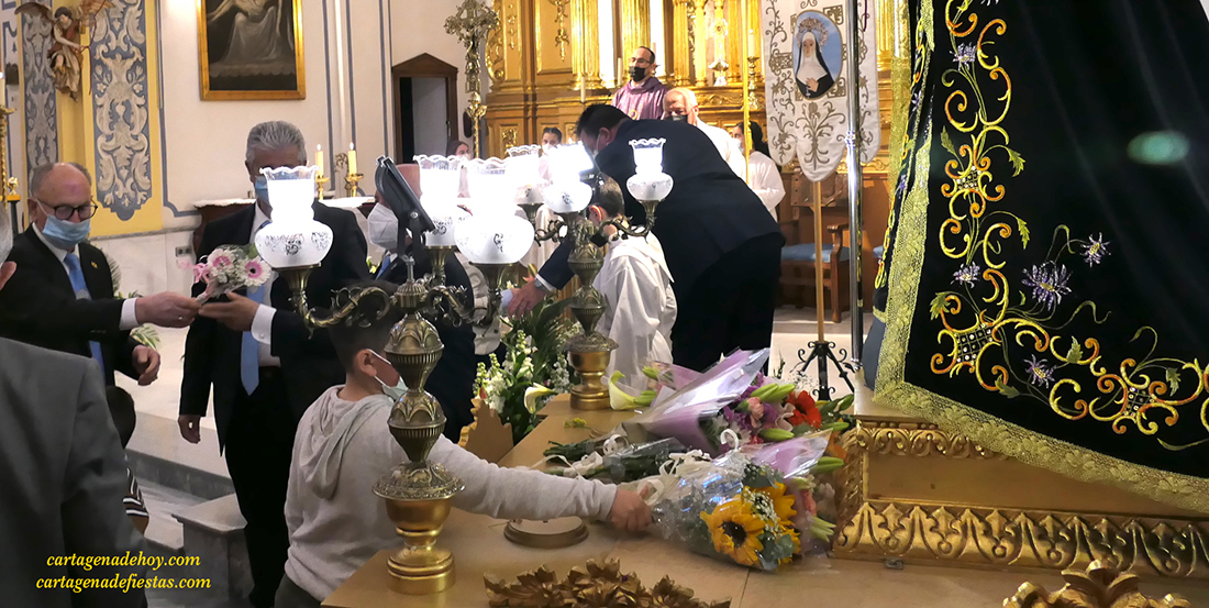 La patrona de La Palma fue ayer objeto, por parte de las asociaciones locales, de la entrega de floreados ramos durante la celebración de una eucaristía en la que, como se observa en la imagen, también hubo quien se arrancó para dedicarle una saeta. Esta tarde, después de dos años de ausencia, la imagen volverá a salir a ‘pasear’ por su pueblo acompañada de sus fieles.