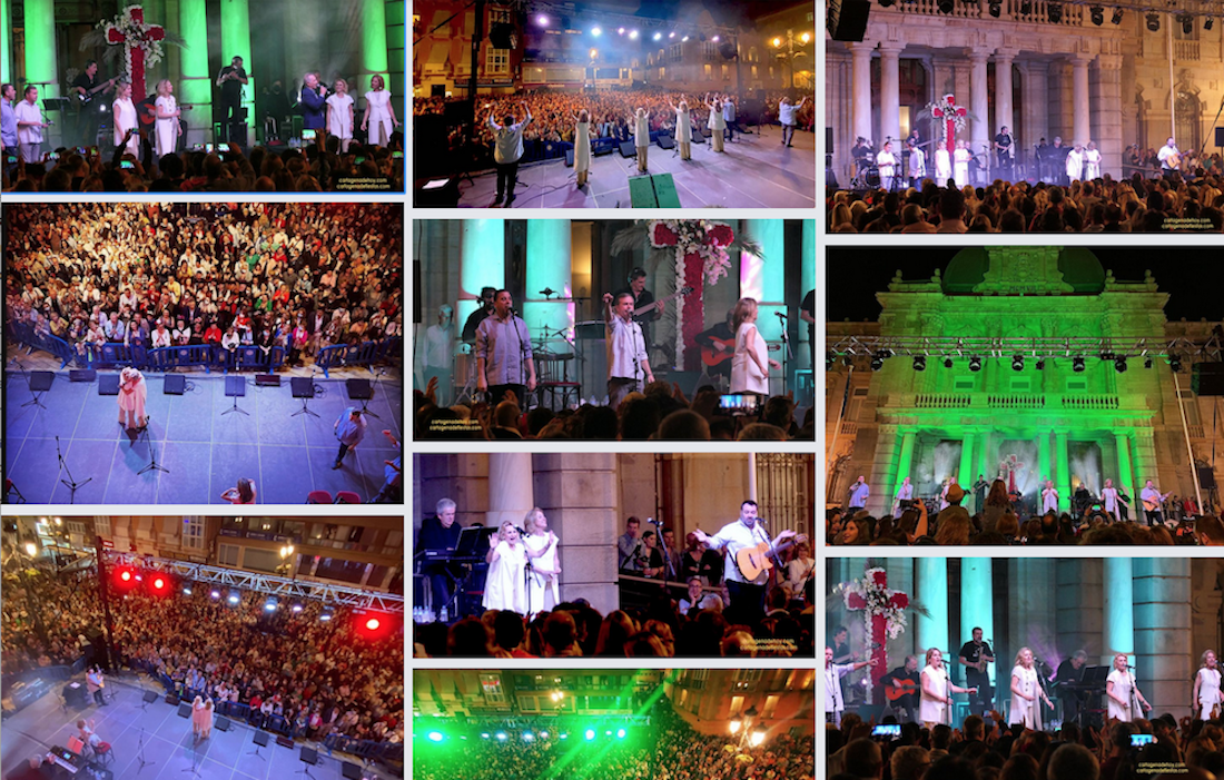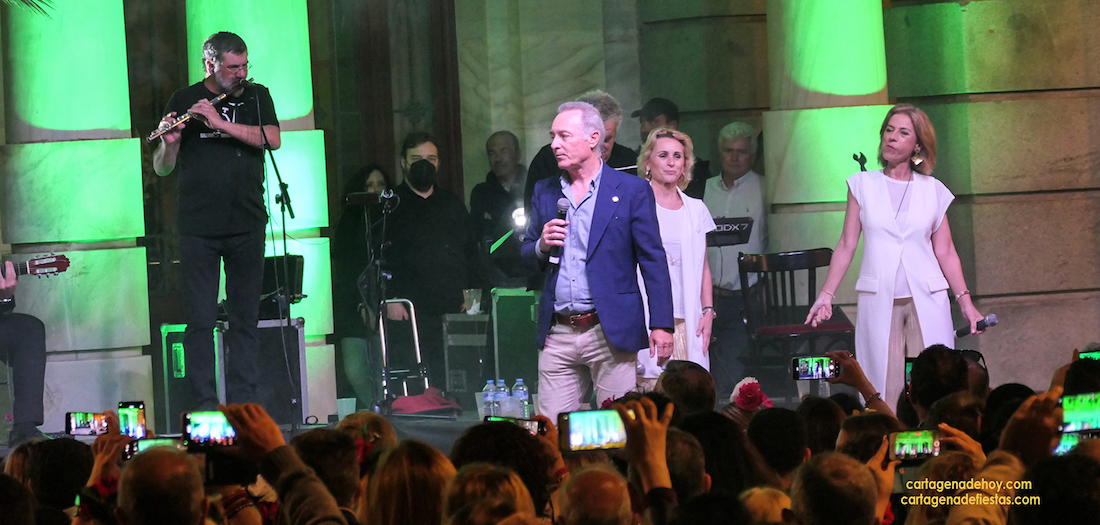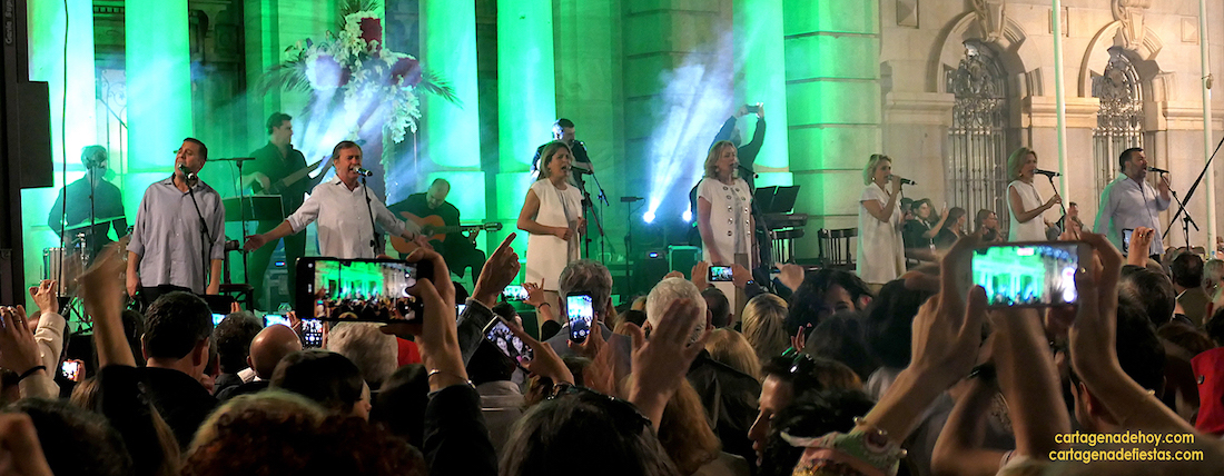 El programa de concierto organizados por el Ayuntamiento de Cartagena para enriquecer el fin de semana de las Cruces de Mayo ha sido un éxito, teniendo como momentos cumbres el concierto ofrecido por José Manuel Soto y el que ofreció Siempre Así ante la multicoloreada fachada del Palacio Consistorial, que se convirtió en todo un acontecimiento, con miles de personas que no se quisieron perder esta presencia, muchos de los cuales cantaron y bailaron los temas que ofrecieron, entre los que no faltaron los conocidos ‘Si los hombres han llegado hasta la luna’, ‘Se me va’, ‘Para volver a volver’ y, entre otros, la popular versión española de ‘A mi manera’ (‘My Way’, de Frank Sinatra), a lo que se sumó, como agradable sorpresa, el que ofreció el grupo junto a José Manuel Soto. El cierre lo hicieron con la ‘Salve rociera’.