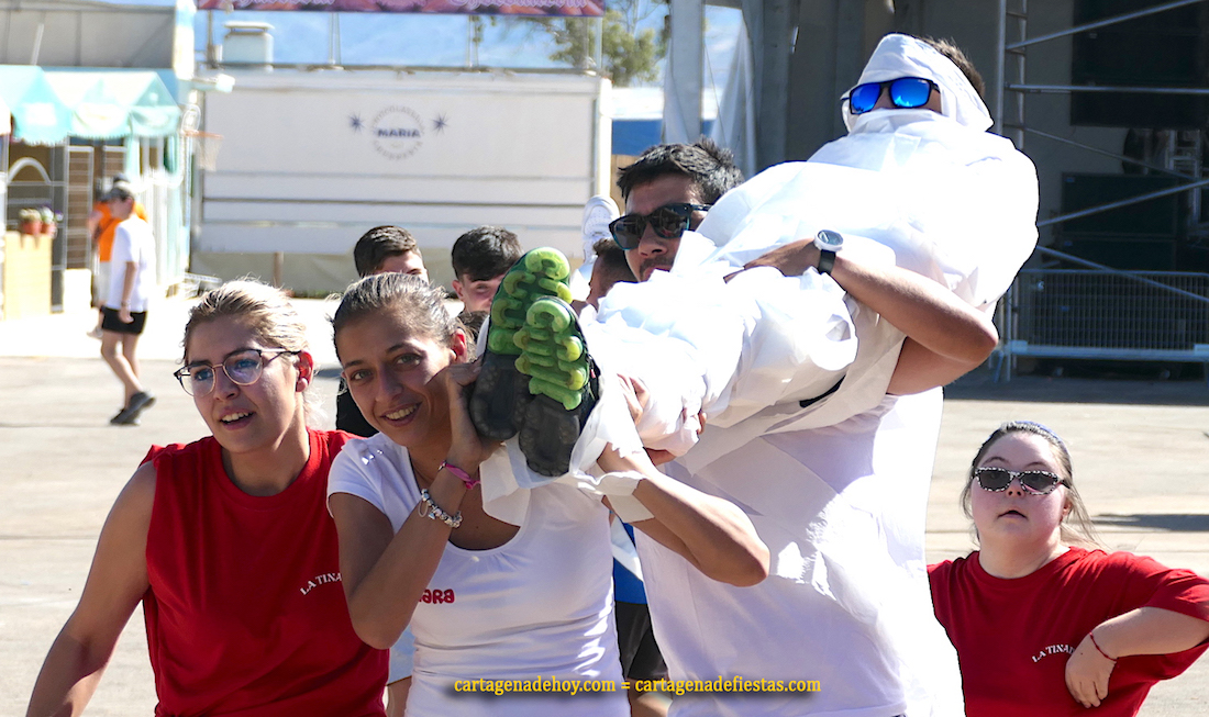 La yincana, que algunos también nombran como 'gran prix', ha generado simpáticas escenas este fin de semana en las fiestas de La Aljorra, en el que la comisión festera decidió que Tutankamón fuese la temática. Cuatro fueron los grupos participantes, uno formado por las damas juveniles de estos festejos y los otros tres de las peñas 'La Tinada', Pakoones' y 'Perretes'.