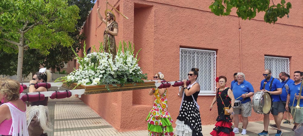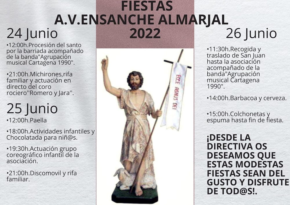 La asociación de vecinos ha preparado un programa que se inició ayer con la procesión de San Juan por la barriada acompañado por la agrupación musico-cultural Cartagena 1990, con noche para michirones, rifa y música del coro rociro ‘Romero y Jara’. Hoy hay arroz y actividades infantiles, mientras que el domingo acaban los actos con recogida del santo, barbacoa, hinchables y fiesta de la espuma.