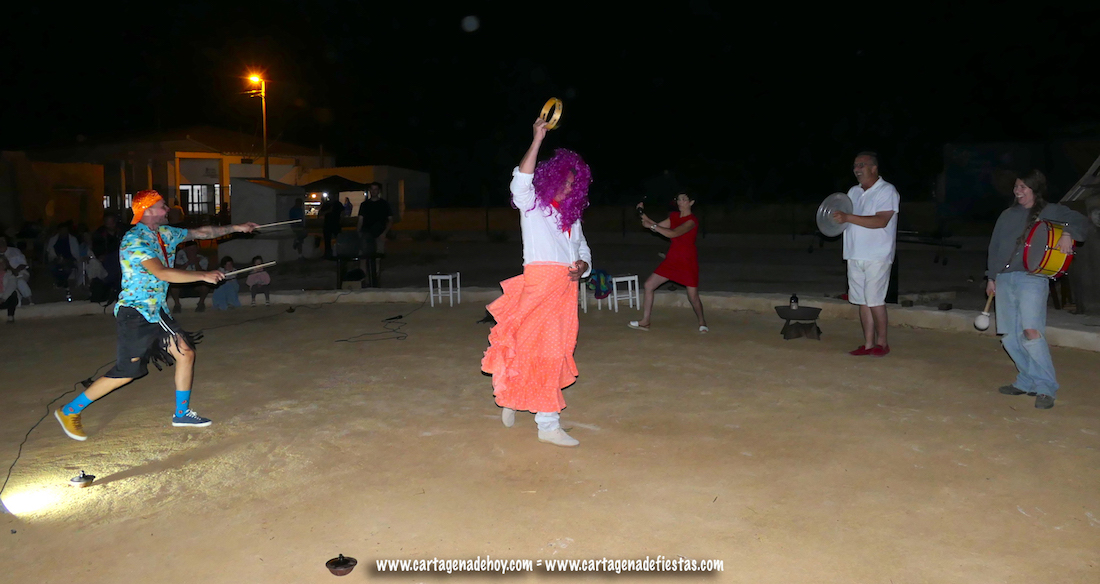La Magdalena, ofrece y sigue. Esta vez el motivo era la noche más corta del año, en la que han vuelto a ser polo de atracción para visitantes con una propuesta que combinó tradición y espectáculo, además de esos momentos de gran valor humano como son las convivencias, lo que tuvo lugar en la primera parte de la noche con los productos que salían de la cantina. Por cierto, algunos de los comensales lucían el pañuelo rojo creado por Pakosky con los símbolos de esta tierra, corazón del secano cartagenero: pozo, oveja, vaca, ramas…