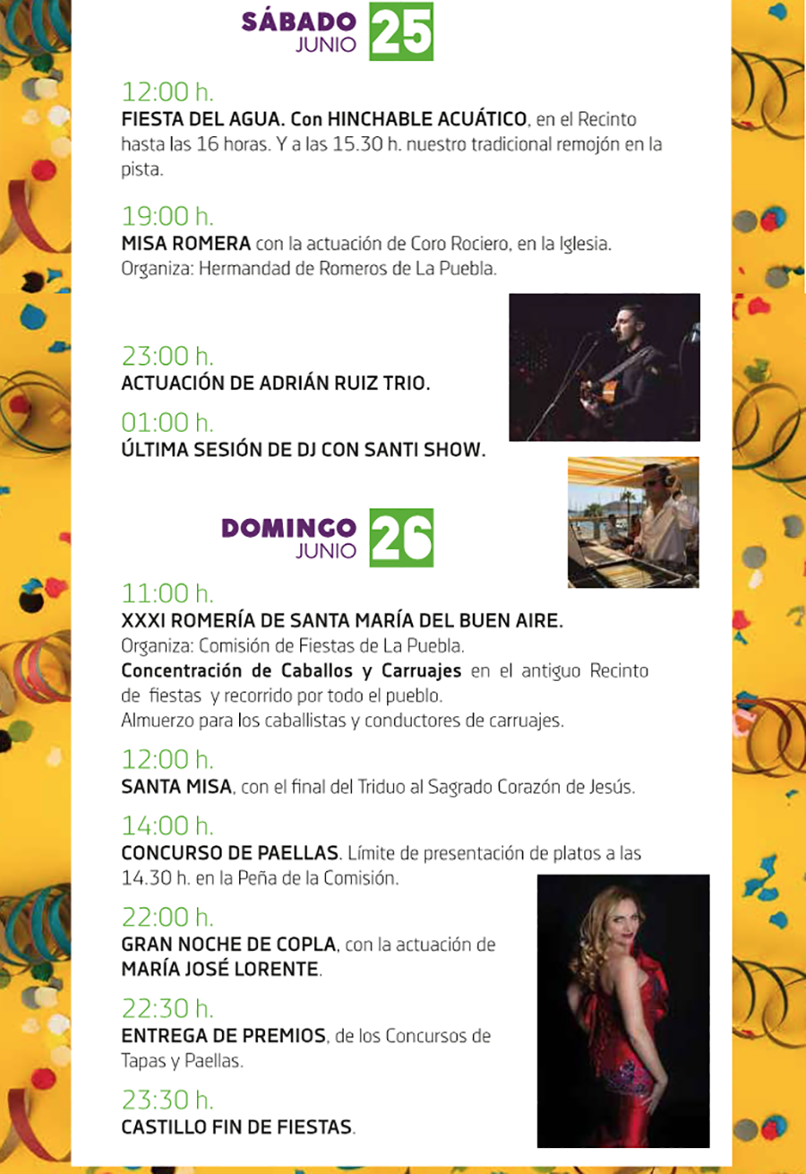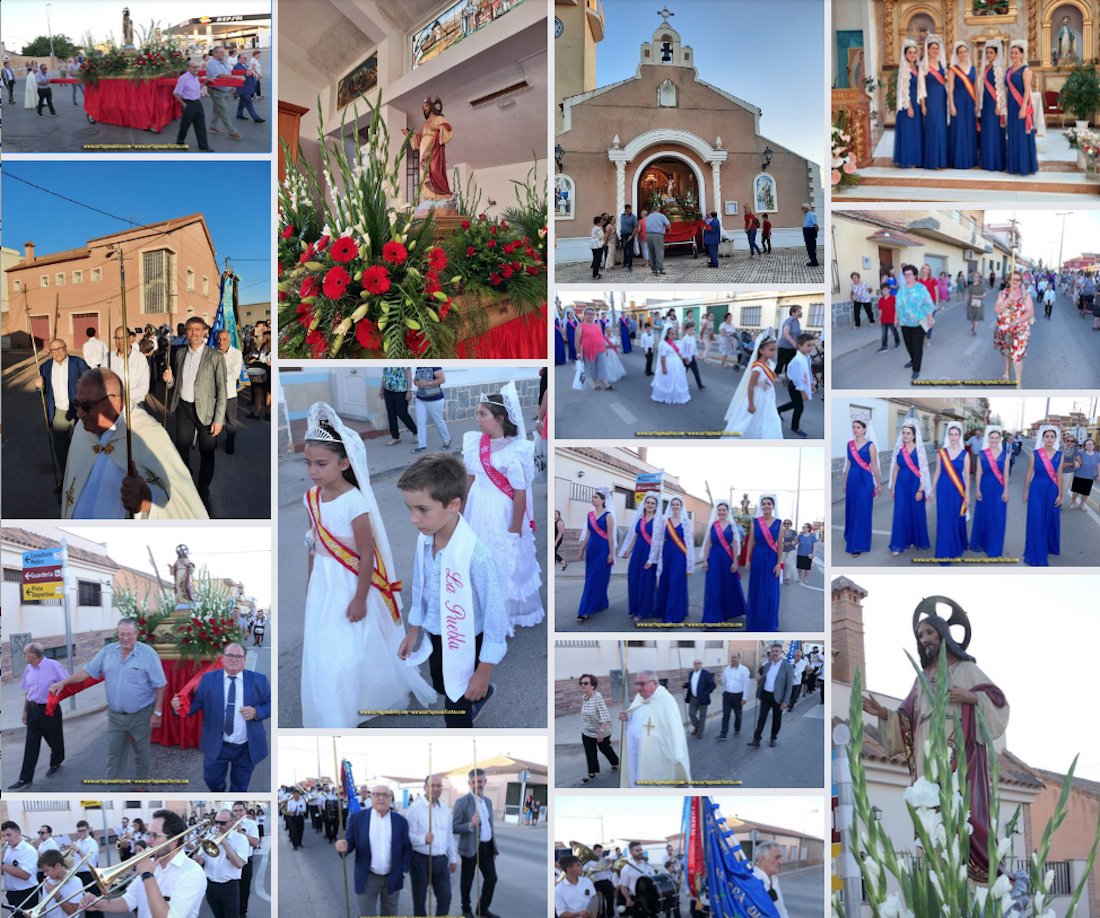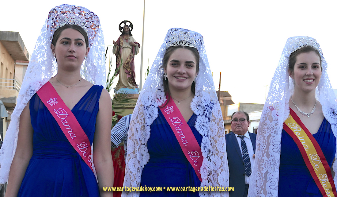 El Sagrado Corazón, tras dos años de obligada ausencia por la pandemia, volvió a salir de su templo para recorrer el pueblo, donde las fiestas llegan a su recta final variadas actividades para este sábado y domingo, destacando la trigésimo primera edición de la romería de Santa María del Buen Aire que tendrá lugar en una jornada dominical en la que también hay concurso de arroces y noche de copla.