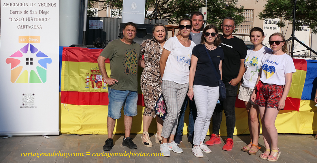 La Asociación de Vecinos Barrio San Diego de Cartagena han superado con alta nota las primeras fiestas populares organizadas para potenciar la vida social de los residentes de este área de la ciudad y ahora el objetivo es consolidarla en los próximos años, siendo un deseo que más adelante se pueda recuperar un desfile marítimo de barcos engalanados, que este año cumple cincuenta años desde que no se celebra. En la foto se observa a directivos del colectivo vecinal con representantes de la comunidad ucraniana, que también han colaborado en estos festejos.
