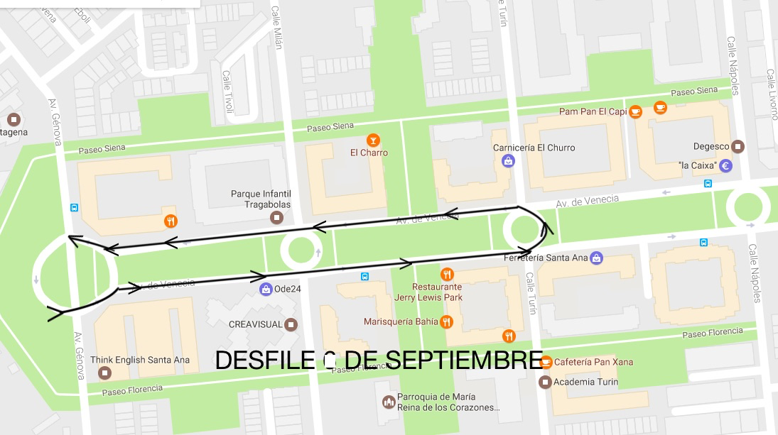 La asociación de la comisión de fiestas, que preside Cayetano García, informa que esta tarde, con motivo del desfile de la comparsa 'Paraíso' y de carrozas estará el tráfico cortado entre las avenidas Turín y Milán entre las 20 y 21 horas. El recorrido comenzará en la plaza de Baden Powell, tomando la avenida Venecia hasta la calle Turín, dando la vuelta por la avenida Venecia para regresar a Baden Powell.