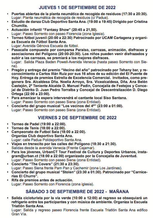 También señalar que la comisión de fiestas ha llevado a cabo gestiones que ha fructificado con una amplia área para aparcar vehículos, que se ubica en la nueva avenida República Argentina. Por otro lado, el programa radiofónico 'Las mañanas de Gaceta', con  Chelo Cánovas, se transmitirá en directo el día 2 de septiembre desde las 10 a las 13:30 horas desde el paseo Sorrento, junto al parque infantil del Mago de Oz. Por la tarde del mismo día estará las cámaras de la televisión autonómica 7RM con el reportero Paco García efectuando conexiones en directo con el programa 'Quédate conmigo'.