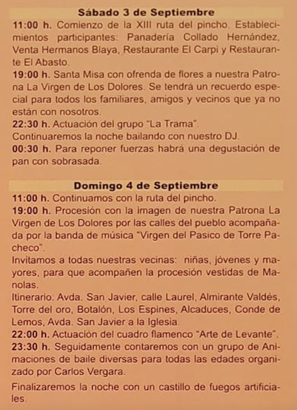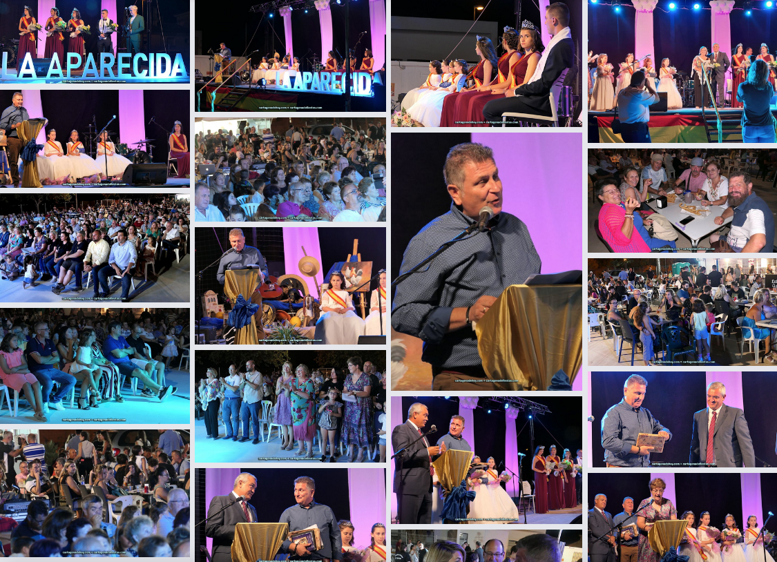 Después era el turno para el pregón, siendo el elegido Antonio Martínez, integrante del club de activos vecinos del pueblo. En su alocución efectuó un recorrido sobre sus recuerdos de infancia, sobre escenas del pasado de La Aparecida, sobre lo que tuvo (como un cine) y lo que dejó huella. También se refirió a las fiestas, “están condenadas a perpetuarse pese a las modernidades”, para más adelante afirmar: “Somos herederos de una gran labor”, en referencia del trabajo efectuado hacia el pueblo por generaciones anterioeres. No ocultó que tenía la esperanza de ser pregonero de esta tierra ante su familia, fieles amigos y vecinos, y no pudo evitar el tono de emoción cuando se refirió a sus padres y al recordado Pepe ‘El Rochero’, dirigiendo sus piropos a todos al recordar el televisivo programa que dirige Alfonso de la Cruz en la autonómica y decir: “La Aparecida está plagada de auténtico oro molío”. Detrás de donde habló, en el escenario, estaba formado un collage de símbolos del pueblo.