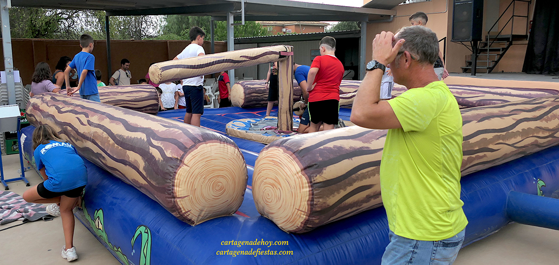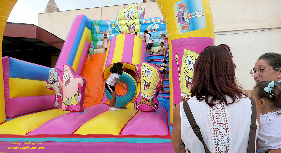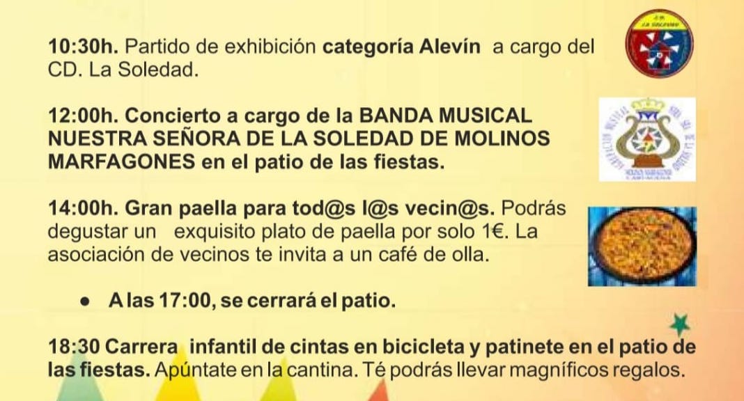 Las fotos adjuntas corresponden a la tarde hinchables gratuitos que se desarrolló en el patio del local social, que es el recinto festero. Otro aspecto importante está siendo la gastronomía. Ayer, por un euro se podía saborear un plato con huevo frito, morcilla y pan. Hoy le toca al arroz. Antes desde las 12 horas, actúa la banda de música de Nuestra Señora de la Soledad y por la tarde-noche hay teatro. Después de esta noche, los festejos abren un paréntesis hasta el jueves.